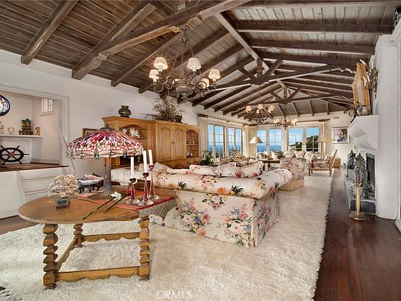 This Historic Mediterranean style Villa was built in 1940 by James H. Cannon (Cannon Electric) it was the focal point for the social events of the day. The Cannon Estate was named and known as Ciela del Mar "Heaven by the Sea". The estate originally consisted of four separate homes, with this being the main home and entertainment hub. Included in the estate was a Guest House, a Gardener's Cottage and a Chauffeur's Quarters with garages located on Glenneyre. The building site at the end of Queda Way, a cul-de-sac, provides tranquility and privacy with spectacular ocean views. The home boasts four bedrooms, five and one half baths, plus the gymnasium or office with a separate entrance, over 4,400 square feet of living space. Elegantly laid out, with the maids quarters on the ground level, two guest suites and gym on the second level, the third floor is the huge primary suite, kitchen, formal and informal dining rooms. The top level is a fabulous Living Room, with hardwood floors and high vaulted hand carved wood beamed ceilings. A reading nook, wet bar and and European style view balcony with panoramic ocean views. All three floors have glorious, panoramic ocean views from San Clemente to Palos Verdes, Catalina Island and coastline, as well as Laguna Village. In the gardens, you will find private brick and stone patios and a charming hidden Koi Pond. A short stroll to Victoria Beach....Be a part of history and be the next proud owner of Ciela del Mar. Note: