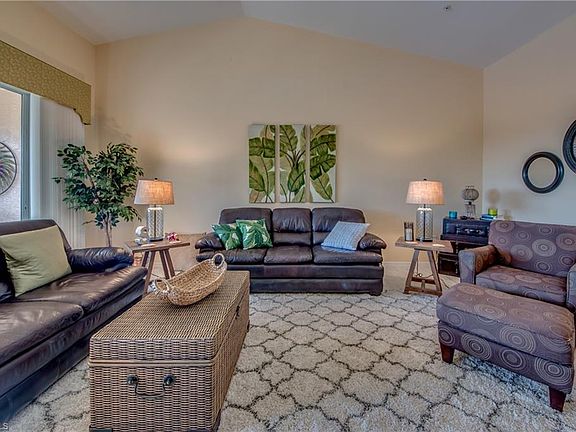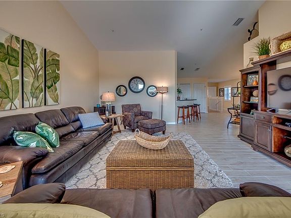 Welcome home to the best value in Sandoval! Relaxing resort style living in the widely popular Sandoval gated community. This is a beautifully maintained three bedroom condo with 1725 sq ft, two full baths & a single car garage. Soaring cathedral ceilings, natural light from every angle makes this condo feel like a home! The tiled lanai is amazing in size & overlooks the widest part of the freshwater lake. Spacious kitchen with breakfast bar, island & large pantry. Inside laundry with washer & dryer. Single car garage plus nearby parking. Walking distance to one of two community pools. You'll enjoy over $30,000 in recent upgrades including new plank tile floors, kitchen island, water heater, interior paint, custom valence, plantation shutters & brand new electric & accordion hurricane shutters. Lots of storage. HOA includes basic cable TV, WIFI/Internet, all exterior maintenance, water/sewer, building insurance, lawn/landscaping & more! A great value for a turnkey SW Florida lifestyle. Sandoval offers biking/walking trails, 2 dog parks, pickleball, tennis, basketball, bocce, horseshoe, social activities/clubs, fitness center, yoga, play area, resort style pool & clubhouse. No CDD.