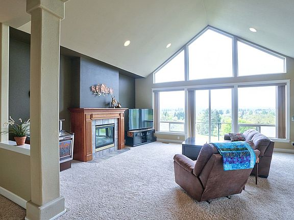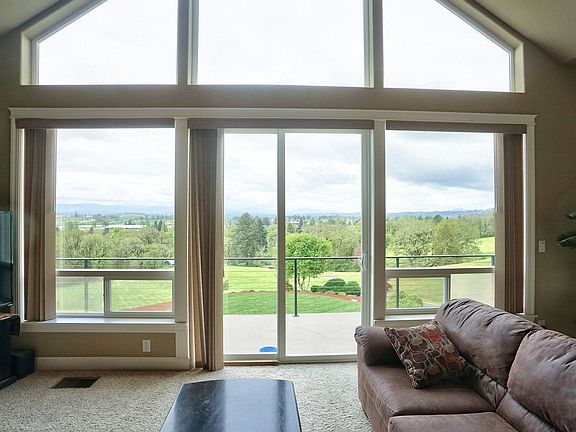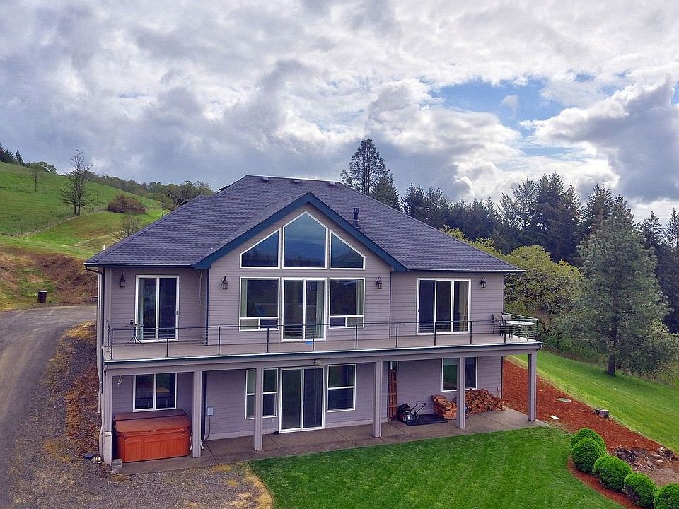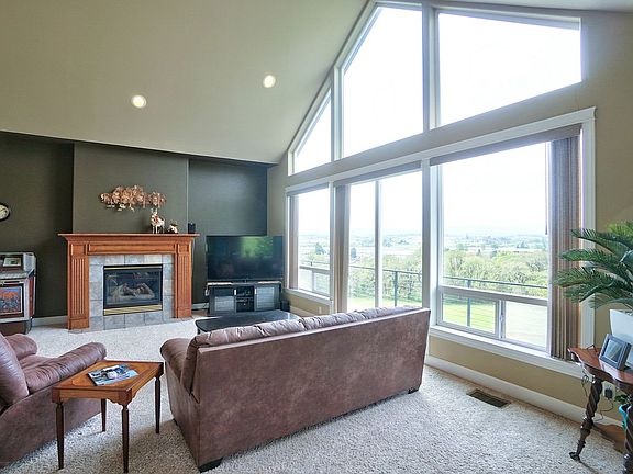 Amazing views from the panoramic windows or balcony of this beautiful custom home, overlooking the valley and coast range. This 11.9 acre home has great potential for your small farm or would make an excellent horse property. The home features hi ceilings and a vaulted family room. Master suite is on the main floor, kitchen with cherry floor and cabinets. Downstairs are 2 bedrooms and a large living/bonus space with wet bar. Must see