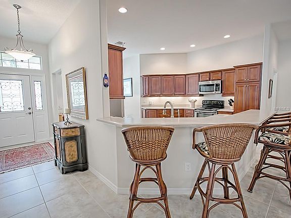 BEAUTIFUL CAMELLIA Designer w/1941 sq ft in the Village of BUTTONWOOD with PRIVACY IN BACK. The front of the home offers a screened front porch and nice landscaping with curbing and rock beds for low maintenance. Once inside, you'll notice many upgrades with large tile flooring, ROUNDED corners, NO PILLARS in the living and dining room and LOVELY walnut HARDWOOD flooring. Sliding glass doors open to the EXPANDED ENCLOSED lanai w/ TILE flooring, complete privacy and leads out to your private fenced patio. The kitchen features UPGRADED CHERRY cabinets w/crown molding & trim on the bottom, hardware, pullouts, under-counter lighting, beveled-edge CORIAN counters, STAINLESS appliances featuring a French door refrigerator w/drawer & bottom freezer and electric range. You'll love the eat-in kitchen nook and for more casual dining, the breakfast bar. The master bedroom has a TRAY ceiling, light hickory HARDWOOD flooring, sliders to the lanai, his/her closets, en-suite bathroom w/WALK-IN SHOWER, his/her sinks, a linen closet and separate toilet room. There is a pocket door leading to the guest rooms and guest bath and both bedrooms feature closets & light hickory HARDWOOD flooring. The guest bathroom features Corian counters & glass enclosed tub w/beautiful tile surround & window. The laundry has extra cabinets & deep soaking tub. There is a water softener AND water filter system under the kitchen sink. This is a BEAUTIFUL home on a quiet cul-de-sac street. FABULOUS location close to Lake Sumter Landing!