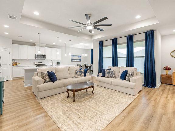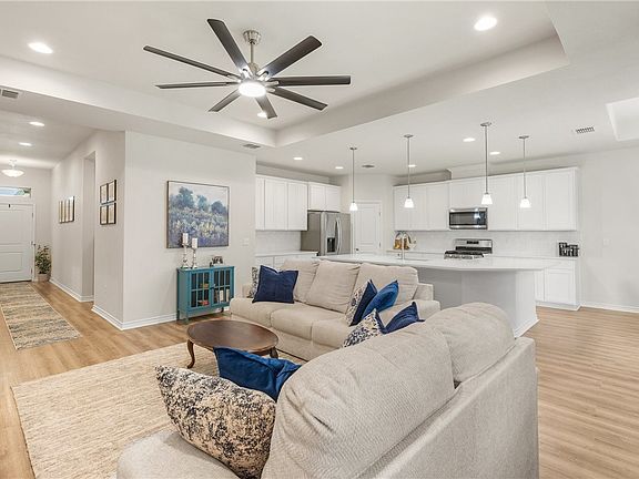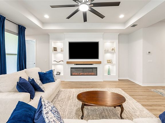 Upgrades include: Custom Accent wall with electric fireplace with pull out mantel, Custom bookcase with window seat, Gutters (sides & back), Cabinets in the laundry room, Overhead garage storm board storage, Window coverings including blackout shades in bedrooms, AND additional lighting throughout...