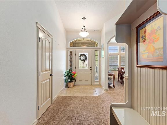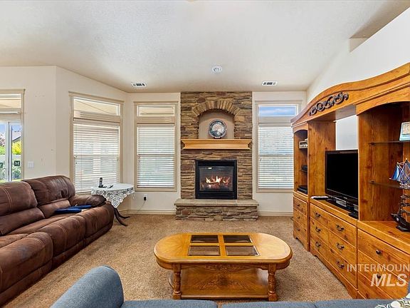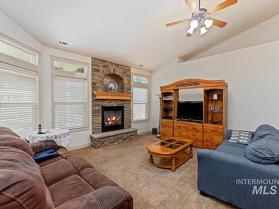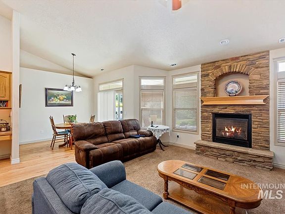 Gorgeous NW Meridian home neighboring Heroes Park, Orchard Park/Linder Village and numerous shopping and eatery options. With vaulted ceilings throughout, the great room and kitchen are bathed in natural sunlight, creating an inviting atmosphere. The stone fireplace in the great room adds a captivating focal point, while the kitchen boasts skylights, stainless steel appliances, a spacious breakfast bar and a built-in desk for easy organization. The formal dining room can easily be transformed into a den, providing flexibility to suit your preferences. The primary bedroom with vaulted ceilings is a tranquil retreat, featuring ample windows and a luxurious ensuite with dual vanities, a corner soaker tub and a stand-up shower. Step outside to discover an expansive covered patio, perfect for entertaining and enjoying the outdoors. The backyard is surrounded by mature shade trees, offering a serene backdrop for relaxation and unwinding.