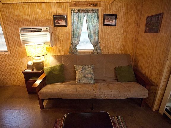 This beautiful cabin overlooking Hurricane Creek has two lofts and can sleep six. It has a full bath, kitchen area, A/C and heat, heated spa, front porch, small breakfast table, small frig, microwave, two burner hot plate, pots and pans, silverware, etc. All utilities included in the rent. Also clean linens are provided once a week by Owner. Sorry no pets. No smoking inside. Contact Jim at 256-557-0829. Owner pays all utilities (water, electric, trash). Clean linens are provided once a week by Owner. Weekly rates are $350. Daily rates start at $59.(Min 2 nights)