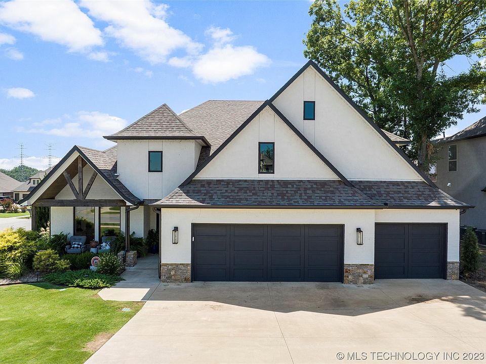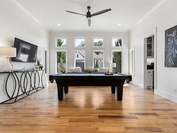 Stunning builders home nestled on a corner lot with pond views in popular Bixby neighborhood! Loaded with amenities!! Bright and open living room with sliding glass doors, custom beamed ceiling treatment, LED lit built ins, floor to ceiling rock fireplace with gas logs. Chef's kitchen has 10 foot granite island with storage, stainless steel appliances + fridge/freezer combo, double ovens, tons of cabinet space, butlers pantry with ice maker + a spacious pantry, and a large breakfast nook flanked with windows. Beautiful Hickory wood floors throughout! Downstairs features primary suite leading to private bath with custom tile work on walls and in oversized shower with dual heads, double sinks + his and her closets. Utility just off bath loaded with storage and additional fridge space. Guest suite with private bath down. Office has built in book case with led backlighting and decorative sconces, vaulted + beamed ceiling. Secondary living space perfect for a pool table. Upstairs includes 2 large bedrooms with built in desks, mini fridge, and LED lighting. Pullman bathroom. Game room with custom built in and a Bonus room. Your outdoor oasis awaits!! Salt water gunite POOL with SPA. Large covered porch perfect for entertaining + built in Grill. Decorative outdoor lighting front and back + soffit lighting, professional landscaping, full irrigation, and gutters w/leaf guard. Safe Room, Full Foam, Recirculating Tankless HW, Extra Deep Oversized Garage, Full Masonry. Smart Home Features. Owner/Agent