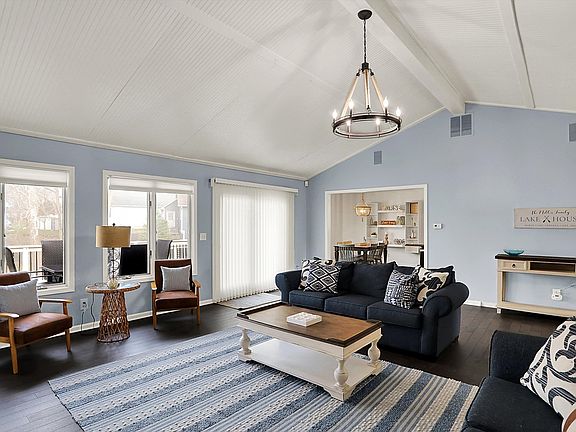 Step into this beautifully designed ranch-style home, offering a seamless open floor plan perfect for lake living. The spacious great room boasts soaring cathedral ceilings and an abundance of natural light pouring in through large windows, creating an inviting atmosphere. The eat-in kitchen is a chef's dream, complete with a breakfast nook and an island for additional seating. The main-floor owner's suite is a private retreat featuring built-ins for optimal closet storage, double sinks, and a tile shower. Enjoy breathtaking water views from the sliding glass doors that lead to a double-level deck ideal for hosting gatherings or relaxing by the water. The finished walk-out lower level includes two additional bedrooms and a bonus room, offering ample space for guests. A large living room provides even more space for entertaining. Step outside to a screened in covered patio, where a hot tub, bar, and additional seating area await, perfect for unwinding while enjoying the views. From the patio, walk directly onto your boat dock and take in the beauty of the open water. The home also includes a 2-car garage and extra parking spaces for guests.
