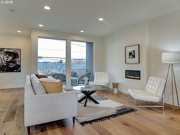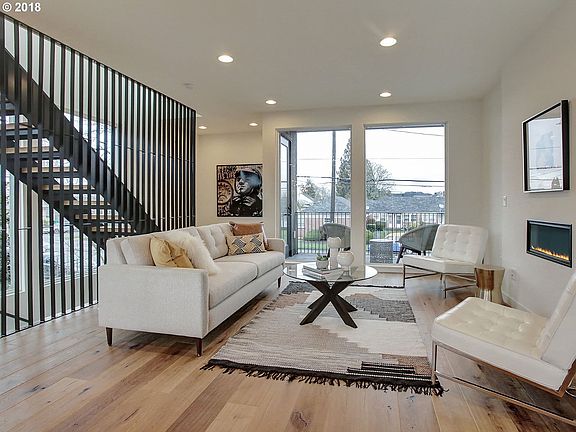 Sophisticated details, Efficient use of space w/ master suite, balcony & en-suite bathroom. Stylish finishes, wood floors, island w/ paneled dishwasher, built-ins & tall windows throughout. Lower level features a den or office w/ separate entrance. Enjoy a low maintenance property w/ time to explore this vibrant neighborhood & beyond. Easy commute distance to Downtown + The Pearl & Kenton & New Seasons are just blocks away. HES:8!