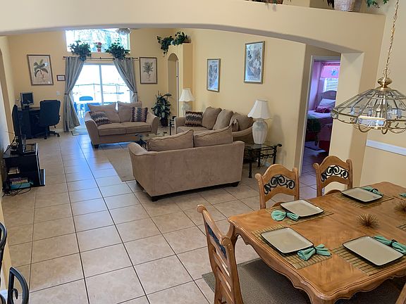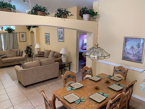 This fully furnished pool home was primarily used as a Winter retreat and has been very well maintained. Located towards the rear of the community this spacious split floor plan benefits from two full master suites (each with ensuite bathroom and direct access to the pool deck and skylights providing plenty of natural light throughout the main living areas. Tiled throughout - including the bedrooms - the home is cool and easy to maintain. A fully equipped kitchen with island/breakfast bar and dinette is in the center of the home and the separate dining area and large living room completes the living accommodation. Outside the inground pool with spa benefits from an extended pool deck and is completed surrounded by 6ft u-PVC fencing providing plenty of space to sunbathe and relax in your private paradise. The covered lanai is large enough to allow al-fresco. Zoned for short term rental and being just minutes from Disney and amazing shops and restaurants on Hwy 192 it would make an ideal vacation home or primary residence.