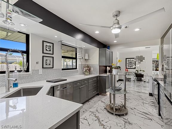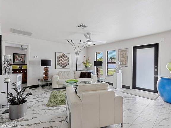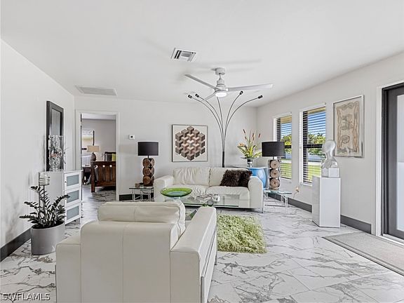 Nestled in the heart of Cape Coral, this amazing home has been totally renovated and ready for a new owner. Open and bright with designer touches throughout, absolutely nothing needs to be done to this stunning 2 bedroom 2 bath home. New tile flows throughout the entire home. The kitchen is spacious and has real wood cabinetry and Quartz counter tops plus a designer backsplash. Under-mount lighting also on upper and lower cabinets. All appliances are stainless steel and brand new! All bathrooms have been updated with Porcelain tile and Quartz counter tops, along with under-mount lighting. Double vanity sinks in the Master Bath, plus designer walk-in shower. Split bedrooms for privacy. A barn door adds a contemporary feel in the Primary Suite. New impact windows and doors for your protection and comfort. Freshly painted both inside and out. Extended single car garage is 24 x 13! Lush landscaping with an auto sprinkler system. Back yard is fenced for privacy. Roof is 2023, AC 2018, and NO flood insurance is needed. You are now HOME!