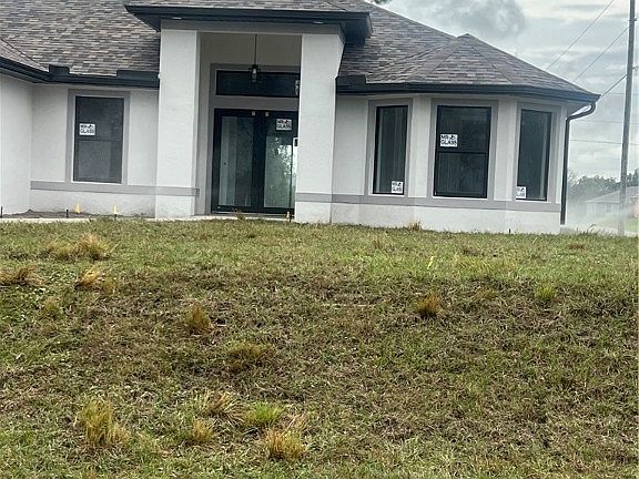 Brand New Construction HOME!!! Property almost ready to move in. This home is located in the desirable SW area of Lehigh Acres on a cornet lot . Home features 3 bedrooms plus den, 2 baths with 24x24 porcelain tile throughout with an open layout. House comes with 42” wood cabinets with modern glossy doors and soft closing hinges, quartz countertops in kitchen, bathrooms, and window sills, kitchen stainless steel appliances, spacious master bathroom shower with glass doors, sprinklers, impact Windows and doors . House is all finished, just missing final cleaning!