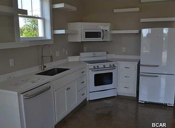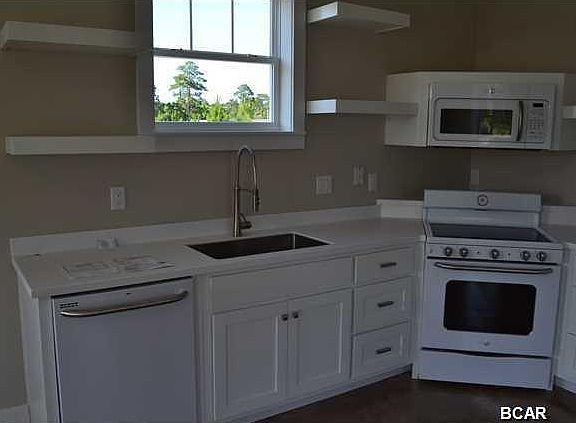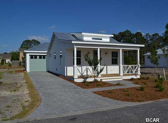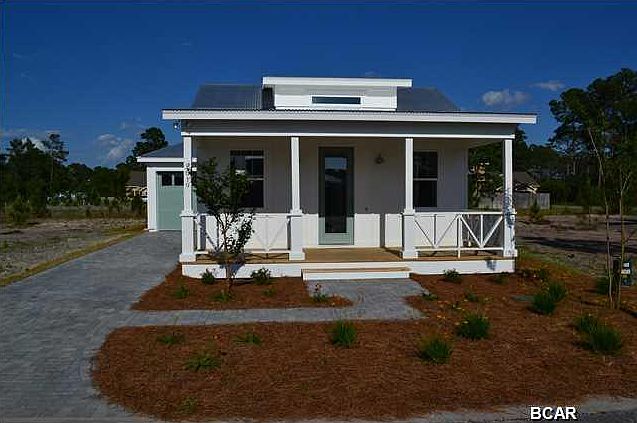 Architecturally designed by Place Alliance, International town planners and Architects, 2 bedroom, 2 bath, Coastal Cottage, centrally located in Lynn Haven, Florida. Well-appointed fixtures and finishes assembled by Baker Designs. This home has true Galvalume Metal Roofing, a deep front porch and board and batten siding. The community is architecturally controlled to maintain the Coastal Cottage appearance throughout the community. Home includes concrete floors, solid surface counters, tile shower and bathroom flooring, shaker cabinets, high ceilings, ceiling fans, retro appliances, plumbing and lighting. The one car garage is to the rear of the house, making the front porch the focal point of the property. Experience the quality and design of The Willows. Furniture package is negotiable.