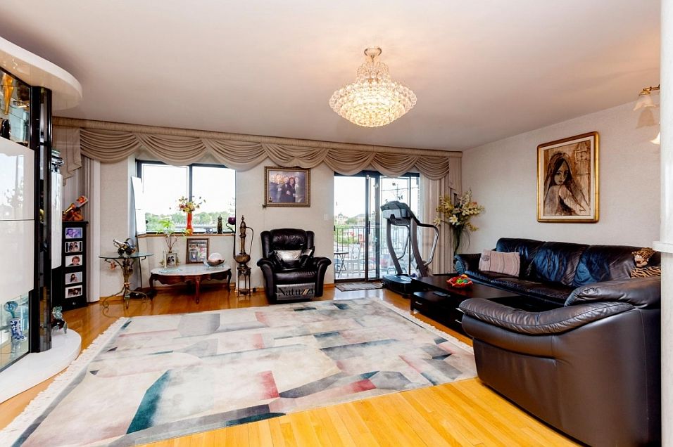 Beautiful 2 bedroom/2 bathroom apartment on the second floor of a 3 story condominium on Emmons Avenue. A nice waterfront view opens from the living room terrace. There is also a balcony facing a garden with pool. Apartment features include central A/C and central heat, washer and dryer. Storage space, parking, gym and sauna are included in the price. This condominium is conveniently located close to transportation, cafes and restaurants.