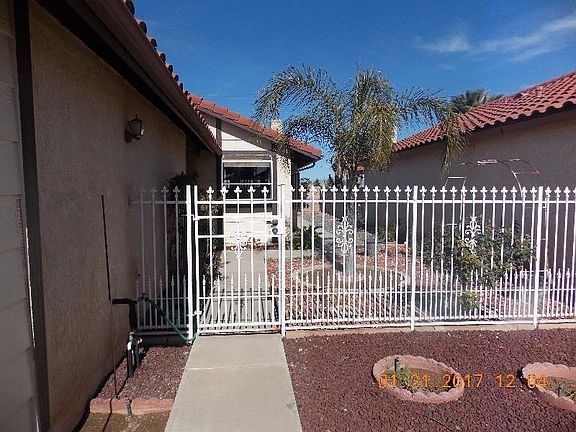 Come see this amazing senior home located in the Sun City Community of Menifee. When you pull up to the property you are greeted with a beautifully low maintenance rock front yard. When you enter the property you will find the kitchen off to the right with the dinning area and the living room straight ahead. The kitchen includes a refrigerator, multiple cabinets for storage and a beautiful bay window. The living room is large and connects to the back yard. The living room also includes a brick fireplace for those chilly winter nights. Walk down the hallway and you will find the guest bathroom which includes a single sink vanity, and a shower/tub combo. The guest bedroom is of decent size. The master bedroom is large with a private bathroom. The bathroom includes a walk-in closet, a large single sink counter top and a walk in shower. The back yard is quaint with a cemented covered patio and low maintenance yard. This home is completely fenced and comes with an added gate for security by the front door. Close to multiple shopping centers and the 215 fwy.