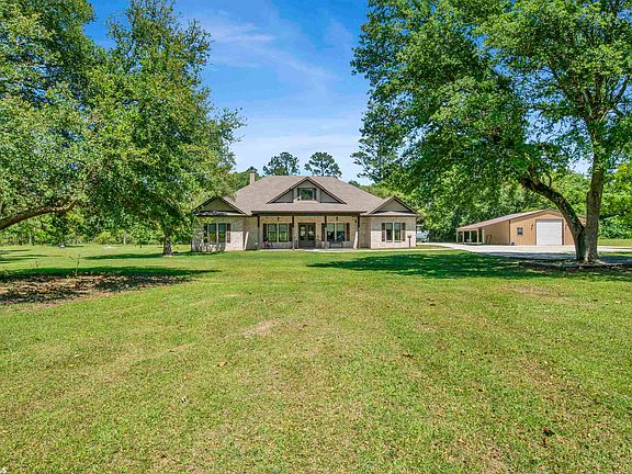 This stunning home in Three Mile Oaks in Elberta has it all. 3 bedrooms down stairs, office and a large bonus room / bedroom upstair that is 650 sq ft that has its own closet and full bathroom. TWO master bedroom suites on the first floor! Master bedroom 1 has a huge walk in closet that you can access from the laundry room. Double vanities in the bathroom with a soaking tub and tiled walk in shower. Master bedroom 2 also has a large walk in closet, with a tiled walk in shower and single vanity with built in makeup vanity. The spacious living room with vaulted ceilings (13 ft) features a wood burning fireplace and flows into the kitchen with tons of cabinet space. Granite countertops, and stainless steel appliances. Tons of storage in this house with an over sized pantry, and a big laundry room. This home sits on over 3 acres of land with a 4 car garage plus a 1200 sq ft barn that is spray foam insulated and heated and cooled. The back porch is a perfect place to relax, cook out on the outdoor kitchen and watch the family enjoy the pool. Great location in Elberta just minutes to Elberta schools, town and within 15 minutes to Foley.
