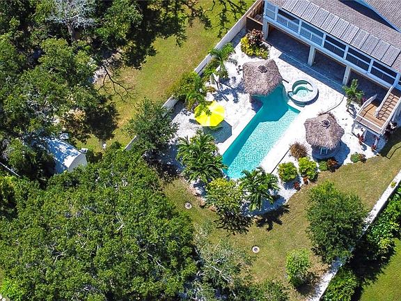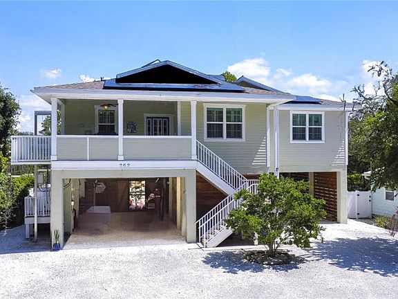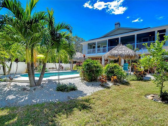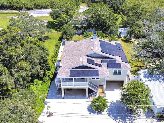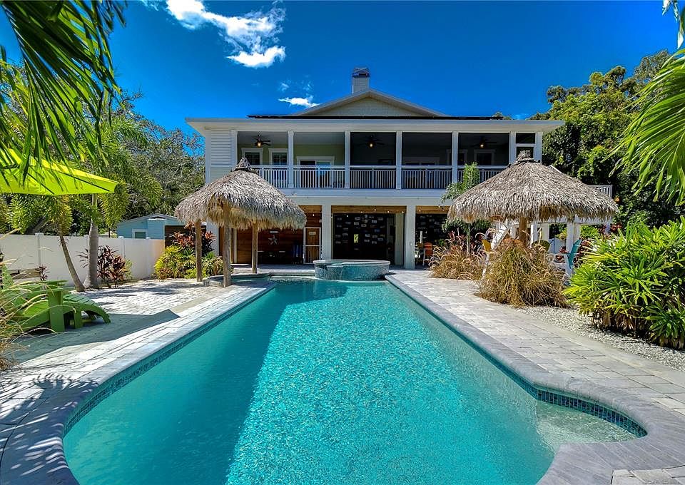 Experience upscale Coastal living in this elevated home...where meticulous construction meets comfortable luxury. Designed to embrace the Florida lifestyle inside and out, this wonderful property offers so much to enjoy. From a Breezy, light and bright interior to a tropical oasis backyard, it was Custom designed and built in 2016 with impeccable attention to detail and fortified for strength. This private stilt home offers both casually luxurious living and peace of mind. It proudly sits 17 feet above sea level on a private .32 acre lot and was constructed to rigorous FEMA standards. Crafted for resilience and eco-conscious living, the home features Hurricane-rated impact windows and doors, 55 solar panels that keep electric bills to an astonishing $30 per month, 140-gallon propane tank powering on-demand hot water, a grill, and generator connections, and all of the under home lumber is desirable "saltwater splash" dock grade, and pilings, headers, footers are concrete. Inside you will discover a space that wows with high quality and uniquely designed finishes.. custom shiplap walls, barn door accents, soaring vaulted ceilings with dimmable LED lighting and fans, and plantation shutters throughout. The floorplan is fun and functional and just right for everyday living or entertaining. Enjoy generous bedrooms, laundry utility room, and walk in pantry. Sliders from Living Room and primary bedroom open to an amazing screened in patio overlooking the backyard. 1000lb exterior elevator lift, 240 sqft of under home storage and under house/carport parking for up to 8 vehicles! And the Backyard...will truly take your breath away! It is private oasis that would make Jimmy Buffett proud! Showcasing a 2020 heated and cooled sparkling saltwater pool complete with spillover spa a shaded grotto seating, two locally designed and hand crafted tiki huts, and over 1,500 square feet of pavered patio space, and just under 2000 square feet of covered patio space for shady lounging and outdoor living, a whole house mosquito misting system and a retro fabulous custom outdoor surfboard and cypress lined shower. Your guests will never want to leave! Ozona is a unique community with coastal charm, 5 marinas, restaurants that are loved, and a waterfront with the most beautiful sunsets! Ride your bike or drive your golf cart all around town! This area is in unincorporated Pinellas -- possible short term rental and available fully furnished! Come make 262 Banana Road your Coastal Paradise! View matterport and virtual tour at https://my.matterport.com/show/?m=t4Nu3C1amJL&mls=1