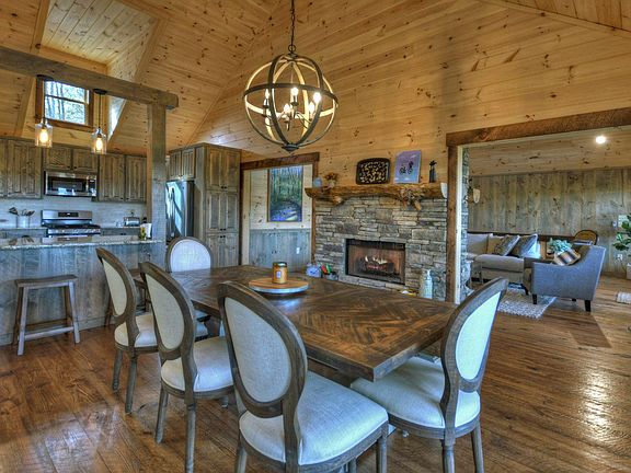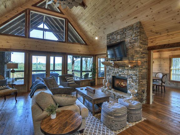 Stunning 4/3.5 custom home in the heart of the Aska Adventure area! Amazing year round mountain views & you can hear the rushing waters of the Toccoa River! Open & inviting great room featuring a wall of windows & a 2 sided wood burning fireplace. Spacious modern kitchen w/ custom cabinets, granite counter tops, tile back splash, farm house sink & breakfast bar open to the large dinning area. Master on main w/ double vanities, walk in closet, & tile shower w/ soaking tub in the shower. Full sized laundry room & a 1/2 bath round out the main level. Terrace level features another master suite, full sized bar, great room w/ fireplace, another full bath & 2 more bedrooms. 2 levels of covered outdoor living space, outdoor fireplace & a garage. The absolute best location in Blue Ridgetrails, river, lake & close to town!! Upscale furniture is negotiable.