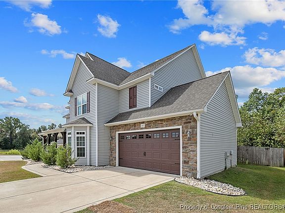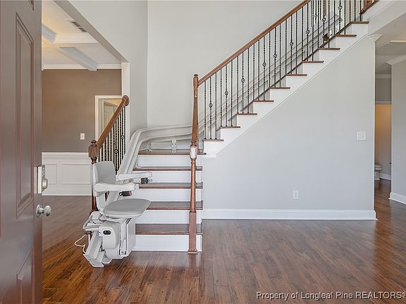 Stunning home in Turnberry full of natural light with only one next door neighbor. Beautiful Timbers adorn and support the front entrance, complimenting the stone framed garage doors. The 2-story foyer greets you as you go through either the formal dining room or the living room which has a gorgeous bay window. The open kitchen has an eating area, a gas range, stainless steel appliances and a pantry. The large family room, a bedroom with a full bath, a ½ bath, and lots of closet space complete the downstairs. Up the hardwood stairs are a jack & jill bedroom, laundry room, rails overlooking the foyer & family rm, and a gorgeous main suite with a sitting area, huge custom ceramic shower with a rainfall showerhead, garden tub, and his & hers walk-in closets. BONUSES: This home comes with a TESLA charger, CAT5 network, 36” Doors throughout, Bruno chairlift, custom light fixtures.