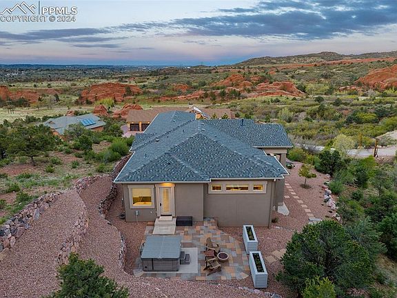 Nestled at the end of a tranquil street on a sprawling 1.5-acre lot, is an architectural masterpiece that transcends the ordinary. This custom-built home offers a blend of luxury, serenity, with panoramic views of Red Rock Open Space, the iconic Garden of the Gods, and city lights. A testament to meticulous craftsmanship, this residence boasts outdoor living spaces that redefine alfresco entertainment. Four view decks and patios, each adorned with a fireplace or gas fire pit spanning over 1100 sq ft of outdoor living space. The gourmet kitchen, adorned with a 60 sq ft leathered granite island, Thermador and Subzero appliances, abundant cabinetry featuring under-cabinet lighting and pull-out shelves. The kitchen seamlessly transitions into a massive great room, dining area, and secondary family space, where raised and vaulted ceilings create an ambiance of grandeur and warmth. The master suite features his and her walk-in closets, crown molding, dual vanities, steam shower, and direct access to the hot tub area. The main-level laundry and auxiliary pantry provide practicality without sacrificing style. Descend the elegant staircase or use the elevator to explore the lower level. A secondary suite, guest bedroom, office or exercise room, and a phenomenal family room await, complete with built-in storage, wet bar, wine storage, and ample space for entertainment. Additional amenities include a drop space with cubicles, under-stair storage, and an oversized three-car heated garage, dog wash station, and elevator access. Located just off Hwy 24, this enchanting oasis offers easy access to the vibrant communities of Manitou Springs, Old Colorado City, and downtown Colorado Springs, as well as outdoor adventures awaiting in the nearby mountains. As the owners bid farewell to this "magical place," they leave behind a legacy of beauty, tranquility, and cherished memories. Welcome to your new home, where every moment is as extraordinary as the views that surround you.