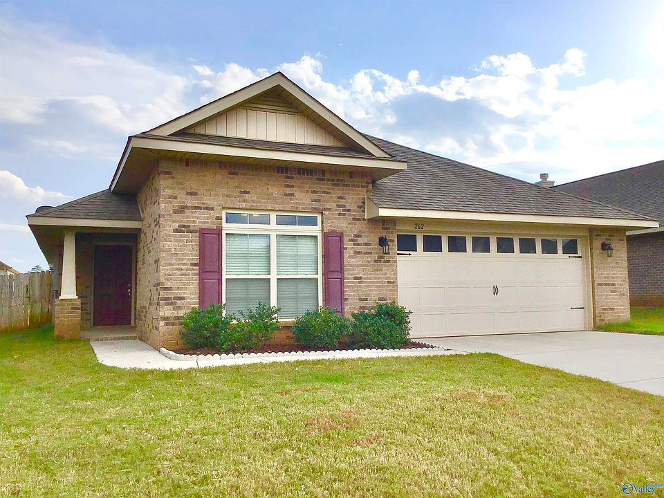 Fresh adorable full brick three-bedroom two bath home with super large fenced in back yard. Brand new paint throughout. Refrigerator, plus washer and dryer are included. Primary suite has dual vanity, soaker tub, separate shower and water closet plus nice walk-in closet. Kitchen and living areas have wood flooring and a sunny eat in kitchen. Madison City Schools Bob Jones