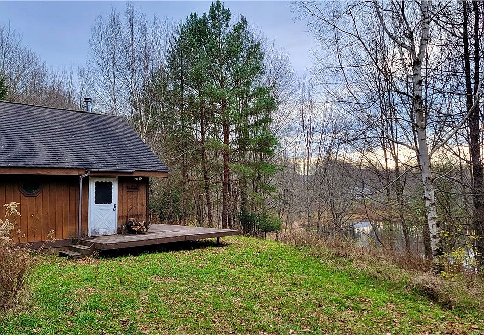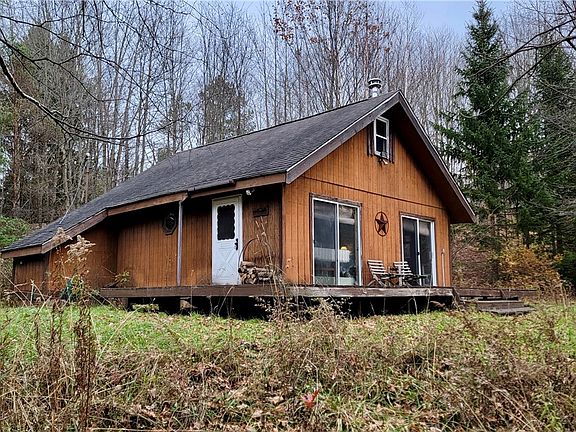 Accessed via a private road, this retreat offers the seclusion you crave. The cabin itself is a cozy sanctuary. The interior exudes a welcoming atmosphere, perfect for winding down after a day surrounded by nature. Featuring an open floor plan that seamlessly connects the kitchen, living room, and dining room, all centered around a captivating wood stove. Also on the ground floor 2 bedrooms with closet space, & 1 full bath. A comfortable loft adding versatility, providing additional sleeping space for three, making it an ideal spot for family gatherings or hosting friends. Slide open the glass doors and enjoy the wrap-around deck offering unparalleled views of the property's picturesque pond. The property features a new roof & drilled well plus brand new water holding tank, ensuring reliable water for years to come. Whether you're seeking a tranquil retreat or a place to reconnect with nature, this hilltop cabin is a private escape that combines the charm of the past with the comforts of the present. Embrace the serenity and make this unique property your own.