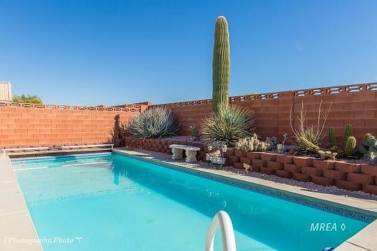 This NO HOA 3 bedroom 2 bath single level charmer has an In Ground Pool, RV parking, 2 covered patios, block wall fencing, iron gate to RV parking, separate workshop in garage with window and AC unit, and an walk in pantry. Sit under your covered patio while enjoying your pool and desert landscaping, a portion of the back yard has established grape vines that produce delicious grapes! Back of home faces East!