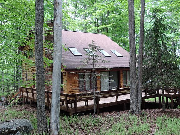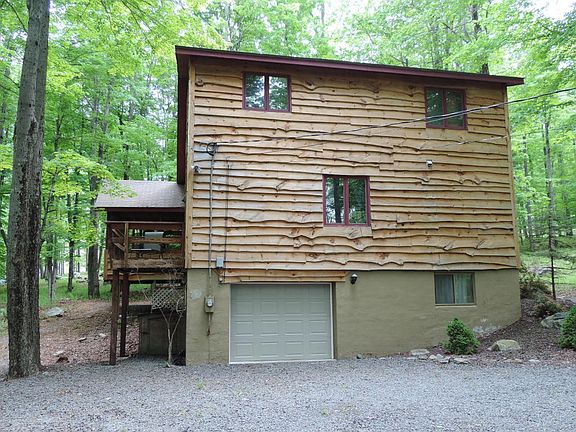 Very private 1800 sq. ft. contemporary home on 1.6 acres in the middle of the Poconos. Country Hemlock siding and spacious deck. Modern kitchen with granite countertops and stainless appliances. Hardwood floors in kitchen, dining area, and great room. Floor to ceiling natural stone wood fireplace in great room. Screened porch off dining area, 3 bedrooms, 3.5 bathrooms, and large loft area. Balcony off master bedroom. Choose your flooring to complete a full basement. 1 car garage.