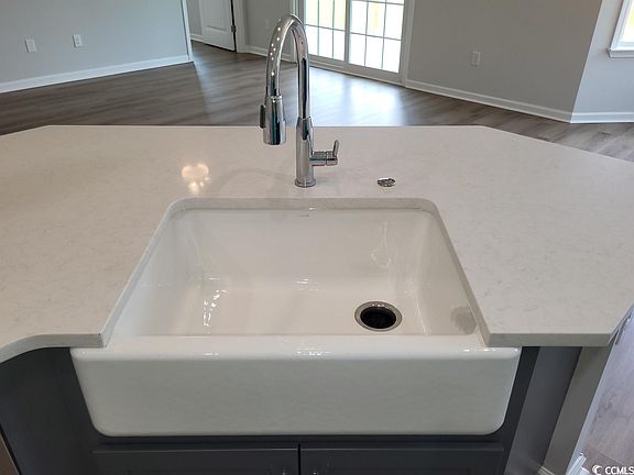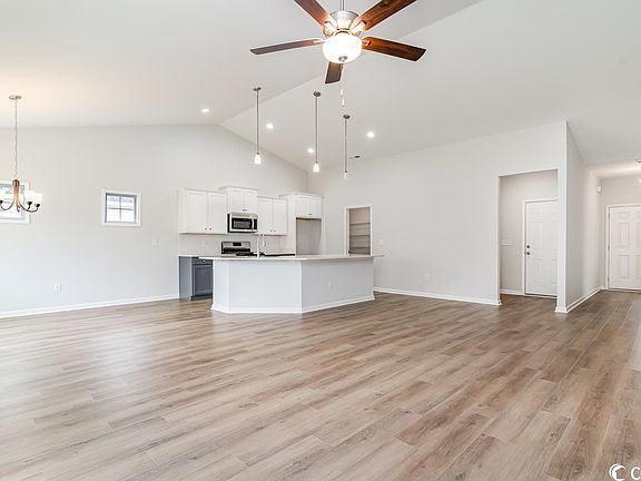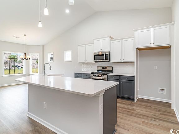 Golf cart to the beach from this beautiful Edisto floor plan on a pond lot, complete and ready for you to move into, by the local builder voted Best of the Grand Strand and Best of the Beach for the third consecutive year! In the Ocean Palms community (Voted Best Neighborhood!). This terrific open floor plan home has wood-look LVP flooring throughout - no carpet! Stainless appliances, staggered-height two-toned grey and white Shaker-style cabinetry, quartz counters, a cast iron and porcelain farm sink, white subway tile backsplash, a walk in pantry and a huge work island/breakfast bar combine to give the kitchen the wow factor you're looking for, while the recessed and pendant lighting plus the bay windows in the dining area and glass sliding door flood the home with light. The sliders lead to a large covered porch and a patio, overlooking the backyard and pond. The spacious owner's retreat features a tray ceiling, walk in shower, long quartz vanity with double sinks, plenty of storage in the cabinetry and linen closet, plus a huge walk-in closet. Two additional bedrooms and a full bath with quartz counter are tucked off on their own hallway, for privacy. All of the homes in Ocean Palms come standard with the luxury of natural gas (tankless water heater, gas heat, and gas range). The garage is completely trimmed and painted, with floored attic space accessed by drop-down stairs, and the front and back yards are fully sodded, with irrigation. Ocean Palms is conveniently located near shopping, restaurants , schools and world class medical offices and hospitals, and is only a short golf cart ride to Surfside Beach's gorgeous beach and the Atlantic Ocean. Other floor plans and inventory homes may be available. Community Pool and Cabana, too!