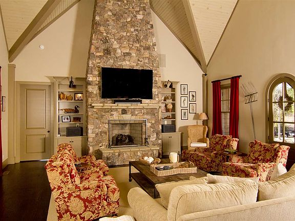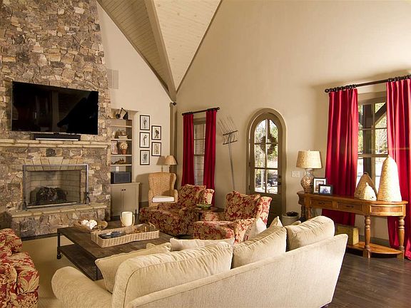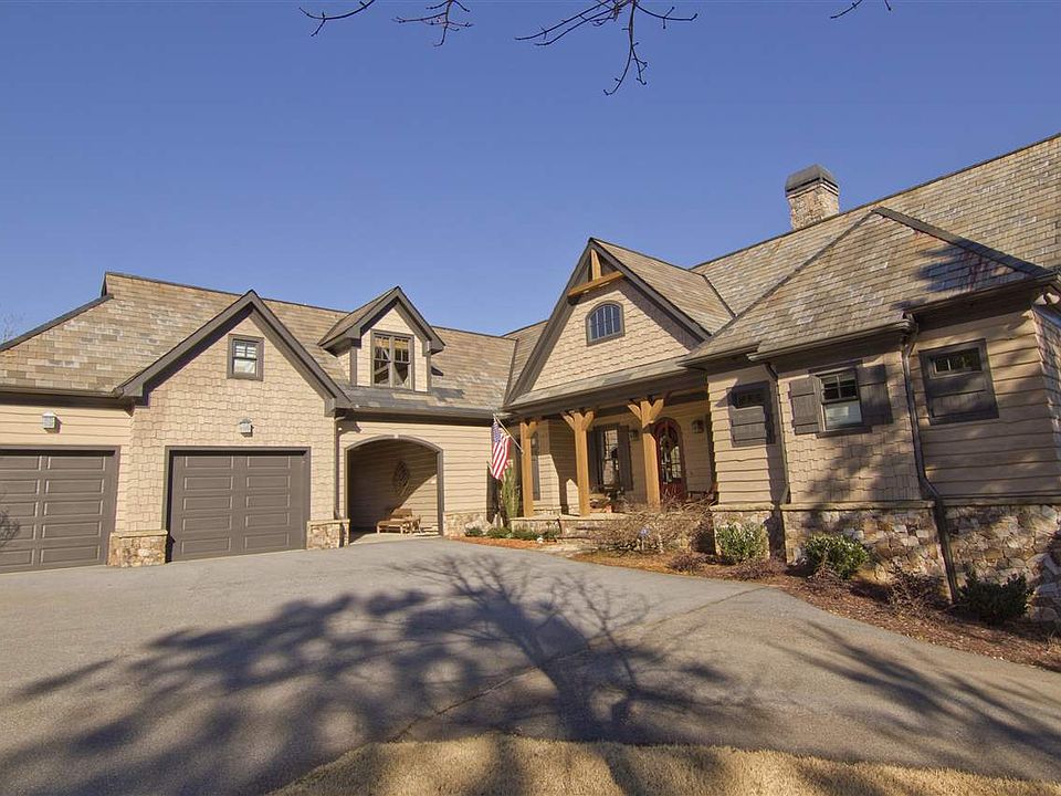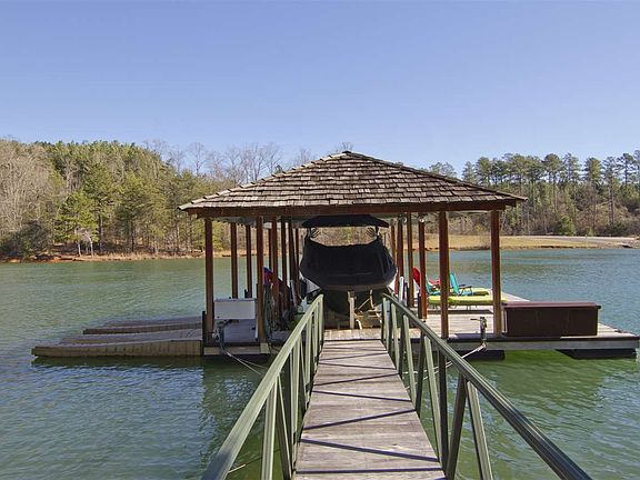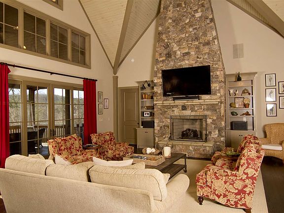 * Four traditional bedrooms with an additional two 4-bed bunkrooms. * Four full bathrooms and 2 half-bath. * Two-car garage. * Handsome exterior of wavy and cedar shake siding with slate roof and heavy beam accents. * Gently sloping waterfront lot comprised of .93 acres. * 5,100 square feet of custom-designed interior space on three levels. * Wonderful floor plan with exceptional open living areas, ample storage and minimal "wasted space". * Exceptional and unique designer touches, including four full masonry fireplaces of Doggett Mountain Stone (from North Carolina), ingenious bunked "staircase", a porcelain pedestal sink, 5' Kohler wall-mounted wash sink and exquisite plumbing and lighting fixtures. * Spacious outdoor living areas, including fabulous screened porch overlooking the lake. * Cedar shake covered boat slip with lift, hydro and water on a very quiet cove. Accessible by a short and comfortable walk or by cart path with turning area. * Delightful kitchen filled with Jenn Air appliances, custom cabinetry, miniature subway tiling, soapstone countertops and seeded glass cupboards and walk-in pantry. * Custom furnishings (which include numerous antiques) are negotiable.