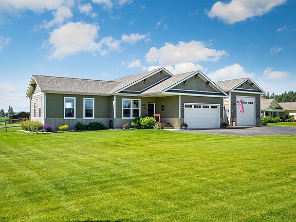 Find the epitome of elegant comfort in this single-level, 3-bedroom, 2-bathroom home situated in a premium locale. The living room and main bedroom are adorned with trayed ceilings, while a natural stone fireplace—featuring a mantel made from historical Kalispell Rail Yard wood—injects rustic charm. Craft delicious meals atop one-of-a-kind, live-edge concrete countertops as you take in sweeping vistas of Whitefish Mountain and Blacktail Mountain. Dual patios and a spacious, fenced-in backyard equipped with a fire pit serve as the perfect backdrop for social gatherings. The home comes with an attached two-car garage, an additional hobby garage with a 7-foot roll-up door, and an RV garage—each insulated and finished—offering generous space for vehicles, tools, or artistic pursuits. This residence seamlessly blends high-end sophistication and practicality, all enveloped by Montana's awe-inspiring landscape. Call Mark Kuhl (406) 407-7509 or your Real Estate Professional.