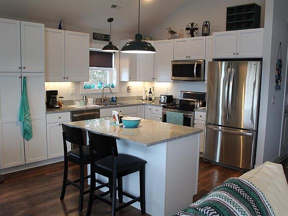 Sellers loved this floor plan and had it custom built with 2"x 6" exterior framing. Tremendous views of harbour with wide navigable canal. This home features high quality wood floors throughout the home. Kitchen is equipped with granite counter tops, all LG stainless steel appliances, including the washer & dryer, under counter lighting, soft close drawers and custom cabinets. Kitchen island and pantry also have pull out soft close drawers. Open kitchen/dining room/great room combination with cathedral ceilings, sliding glass doors out to the sun deck and screened in porch, where the views are amazing. Master bedroom includes a private covered deck, his and hers walk in closets, a master bath with a large custom tile and glass shower, and double vanities. Fully fenced in back yard with an over sized outside shower. Great dock that is 12 'x 12' and has extra pilings to accommodate a future boat lift. There is also a swim/launch platform that is 4' x 11'. There are also 2 convenient ways to enter through the dry entry.
