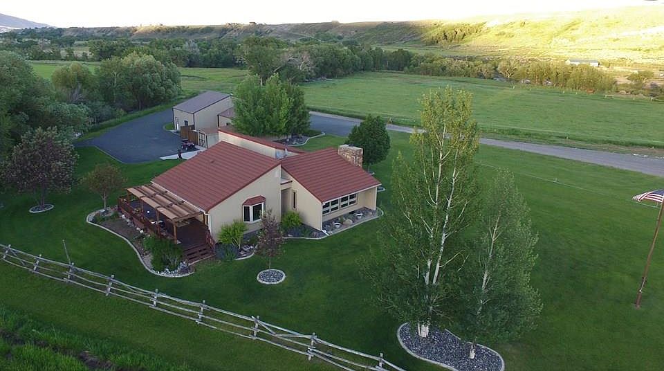 The Bar Flying E has the one thing you can't change: LOCATION-Privacy, Views, Creek running thru the yard, Mature Trees, Horse Property, Production Ground,1892 Water Rights, Hunting and near Public Land. This 4 bed, 2 bath Custom Built One Owner home is Wyoming. Spend the evenings on the deck or in front of the fireplace. Both have endless views. 4+ car garage/shop & add'l RV Barn.