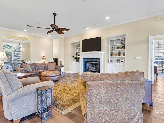 Welcome to your dream retreat in Craft Farms Subdivision with MULTIPLE UPGRADES! This exquisite custom-built 4-bedroom, 3.5-bath home boasts 3,211 sqft of luxurious living space, perfectly situated on the 15th green and 16th fairway of the Cypress Bend Golf Course. Step inside to discover a spacious open-concept layout, for both entertaining and everyday living. The expansive living area features a gas fireplace and wet bar, creating an inviting atmosphere for family and friends. Floor to ceiling windows and french doors offer a stunning view of the golf course and lake. The heated and cooled sunroom and the large screened-in porch also provide the beautiful view for outdoor cooking and gatherings. The gourmet kitchen is a chef’s delight, featuring a gas cooktop and an abundance of storage, seamlessly connecting to a charming eat-in breakfast area. A separate dining room adds to the elegance of this home. The main floor hosts a guest bedroom with bath, while the luxurious primary suite is designed for relaxation, featuring a cozy nook for an office or sitting area, again with the golf course and lake view! The primary bath offers double vanities, a relaxing jacuzzi tub, and a standalone shower. Upstairs, you’ll find two spacious guest bedrooms with a private bath and a cozy settee area on the landing—for a quiet nap or reading time. Additional highlights include a large laundry room with ample storage, a double car garage plus a dedicated golf cart garage, a 7-zone Rain Bird sprinkler system, floored attic space for extra storage.Recent updates include newer roof, refrigerator, new paint, luxury vinyl flooring, lighting, and newer HVAC units, ensuring modern comfort throughout. Craft Farms is a vibrant golf course community offering membership opportunities to enjoy world-class courses, as well as social memberships for access to the pool and pickleball courts, and member-only events. Buyer to verify all information during due diligence.