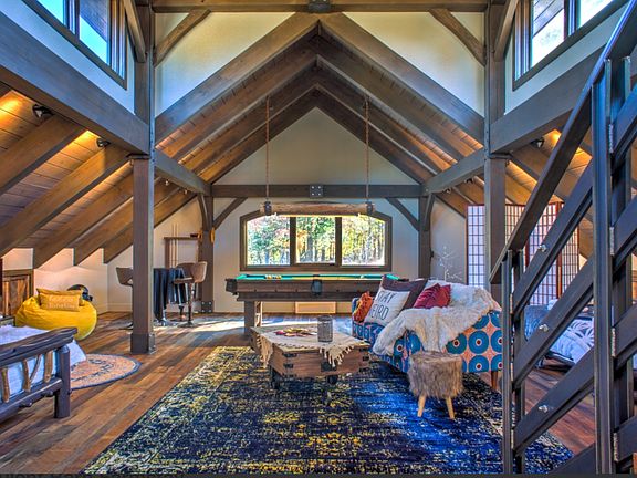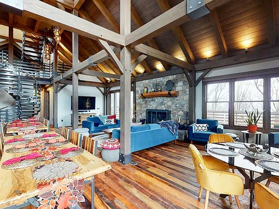 This is an incredibly unique property initially built to host events & house people working with us on a small 160 acre organic farm. It's hosted a handful of events and guests since covid but is very much in new home condition. We are located overlooking north Asheville and minutes from the restaurants and night life of downtown. The residence has two master bedrooms (both with king size beds and full baths - one has soaking tub and shower, the other with a shower; a third bedroom with full size bunk beds. There is a guest loft with two queen futon sofa beds, no bath (a 1/2 bath at the base of both the stairs to loft and inside the downstairs entry /stairwell to the residence). This listing is for 2 full baths and 2 half baths. You can tour the property virtually on the village farms website at villagefarmsasheville com under the farm-stay section. There are many custom amenities such hand-crafted barn doors, a glass-encased wood-burning fireplace (amazing for winter), gorgeous timber frame and reclaimed floors throughout, artisan rendered spiral staircase, and a sonos sound system definitely set this new home above the rest. The gourmet kitchen was designed with your inner host in mind. Large dining space with wrap-around bar seating and gorgeous chiseled edge countertops, while the dirty work hides behind the barn door in the restaurant-style prep kitchen featuring practical stainless steel surfaces and a helpful double oven. We could see a number of configurations working in terms of modern families joining us here; a family of adult professionals could share this space as easily as a family with older children or one with parents living with them. It's obviously a great space for socializing with pool table, tea/meditation loft, firepit, a big long dinner table and deck. It is totally furnished and ready to move in. You do not need a thing. Whole house water filtration and on a generator is peace of mind after Helene You won't find another spot like this one. Endless natural beauty and healthy farm living. No smoking, no pets, no more than 3 vehicles onsite overnight. Utilities can be done quarterly or flat monthly based off history. We will detail in agreement.