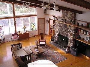 Rare 14.4 Acres located just before the Byrdcliff Arts Colony, this property is waiting for someone to add that personal touch to bring this mid-century modern gem to its full potential. The long driveway leads you to a privately located 3 bedroom home. The architecture reflects the Bauhaus design both inside and out. Upon entering you will appreciate the soaring ceiling using post and beam construction to create a large open space in the living room and a second story loft with full bath. Light streams into the room through clerestory windows and falls upon a massive floor to ceiling stone fireplace. True to the original design concept, there is built-in furniture throughout the home. In the sunken master bedroom there are lighted wall panels and a wall of windows that look out onto the forested property. The eat-in kitchen opens out to a bluestone patio. There is also an in ground and heated gunite pool that is filled from a second well located behind the 2 car garage. There are several walking paths through the property surrounding the house, walk to town or to the Byrdcliff Theater or the eventful Byrdcliff Barn. 3 Acre zoning may allow for a subdivision of the property. This is a truly unique and appealing property on a rare large Woodstock parcel in an historically important area.