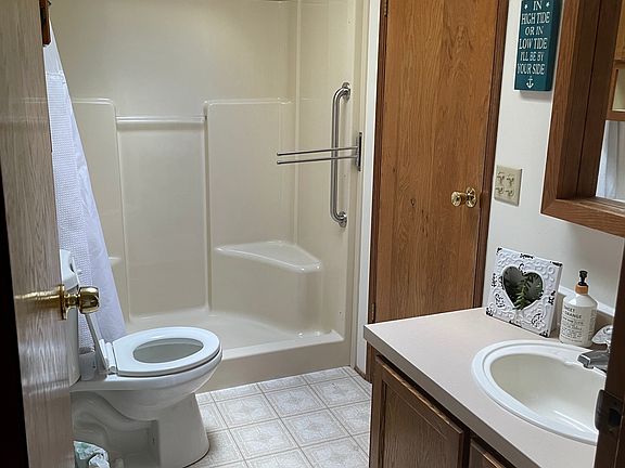 Inside, you'll find an inviting open floor plan with large picture windows that fill the home with natural light. The living and dining areas flow seamlessly and include a cozy wood stove, perfect for winter nights. A generous kitchen features abundant cabinet space, a large center island, and skylights that keep the whole space bright and airy.