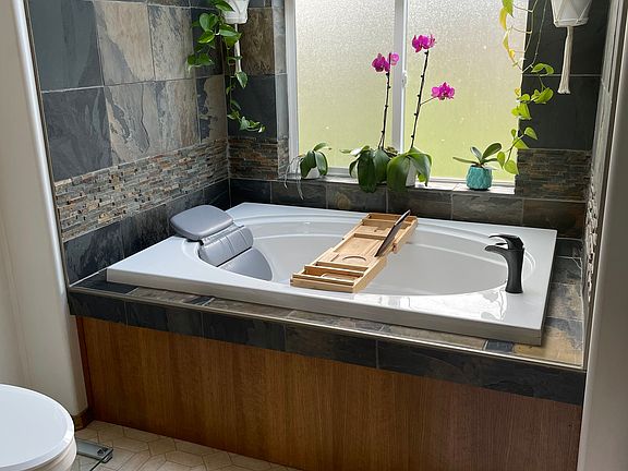 Both bedrooms are oversized, especially the primary suite, which includes a walk-in closet and a spa-like bathroom with a deep soaking tub framed by slate tile an ideal place to unwind.