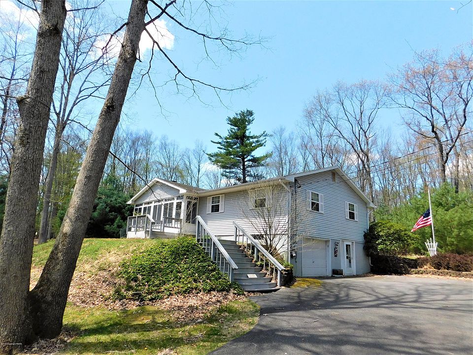 Welcome to 262 Whispering Hills in East Stroudsburg, Pennsylvania! This versatile Raised Ranch is tucked in a quiet, shaded corner of Whispering Hills Estates, with no HOA dues. The first floor and the heart of the home offers open concept living that includes the living room, dining room, and kitchen. For even more gathering space, there are three additional sunroom patios, including one with a new Hot Tub! Down a wide hallway, you will find a master bedroom with two closets and an en suite bathroom, two additional bedrooms, and another full bathroom. In the lower level, is a full family room, a workshop space, and an oversized one-car garage. Outside you will find a well-landscaped yard with two storage sheds. This is a well built, quality home with owners that lovingly cared for it.