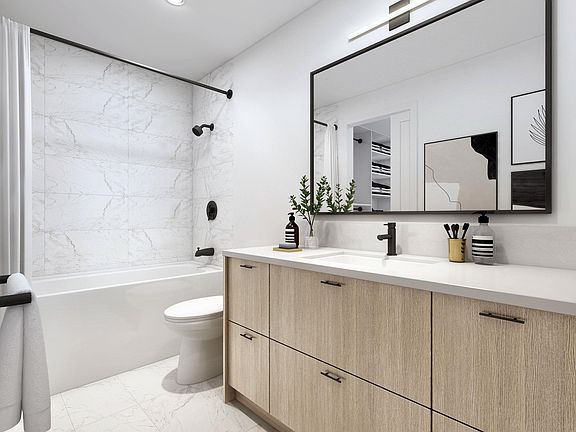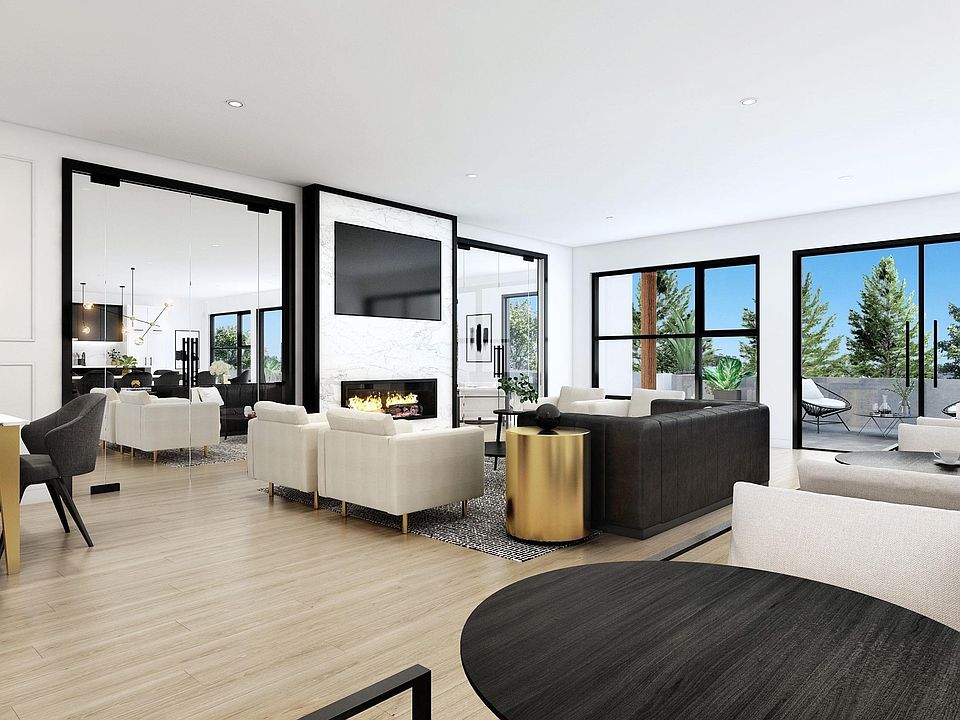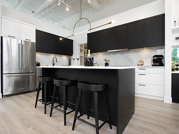 Open layoutBlack matte fixturesQuartz countertopsPrivate deck