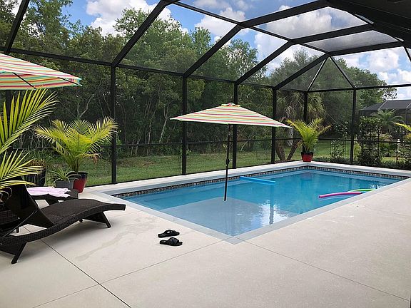Terrific plan featuring eat in kitchen, indoor utility room, large great room, den with French doors and wood flooring, formal dining room, 3 car garage, large bedrooms, garden tub, stone accented front elevation, crown molding, gourmet kitchen appliances, solid surface tops in kitchen, carpet and pad upgrade, Porcelain tiles in master bedroom and master closet, ceramic tile flooring, 6 ceiling fans, 18x14 Lanai, a large beautiful swimming pool with sun shelf and bubbler, outdoor full kitchen and much, much more.