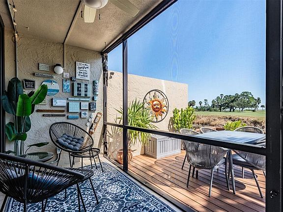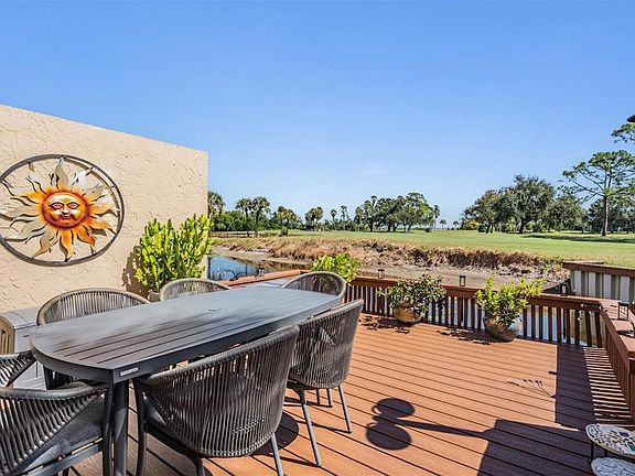 Welcome to one of Cove Cay’s coveted seven condos with an oversized outdoor deck—set above a tranquil pond on the 15th hole—where bay breezes and ever-changing views of water, wildlife, sunrises, and golfers become your daily backdrop. The 16' x 13' deck (208 sq. ft.) was rebuilt in 2025 with composite Trex for beauty, durability, and years of low-maintenance living. Wide PGT impact sliders open to a screened porch that flows out to the deck—hello, indoor-outdoor entertaining. Inside, the open kitchen is light and bright, featuring a double PGT impact window, white soft-close cabinetry, exquisite light granite with neutral veining that doubles as an expansive serving/snack bar, a ceiling detail with crown moulding and integrated lighting, stainless appliances, a deep stainless undermount sink with a sleek black gooseneck faucet, decorative backsplash, and a dedicated coffee bar. Pergo DuraCraft waterproof luxury vinyl plank runs throughout for cool comfort, easy care, and long-term durability. Fresh, airy wall colors elevate the spacious living/dining area, which includes an attractive built-in and the perfect wall for a large TV. The serene primary suite enjoys PGT windows framing the pond and golf course. Its en-suite bath offers a large vanity, distinctive lighting, updated tile shower and flooring, and a custom walk-in closet. The second bedroom flexes beautifully as a den, office, or guest room, and the refreshed hall bath is another win. Practical perks abound: a 2023 Trane A/C, a newer water heater, hurricane windows throughout and your own private laundry room just steps from the front door with full-size washer/dryer, storage cabinet, and high shelving. This corner residence adds privacy and sits just moments from the Village 2 pool and recreation area—as well as your carport. Lush landscaping, shimmering water and fairway vistas, 24/7 security, and well-kept amenities make this the paradise known as Cove Cay.