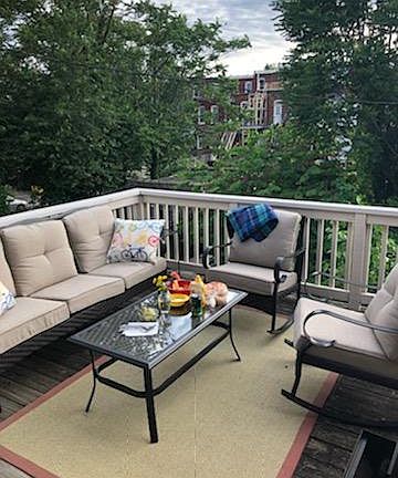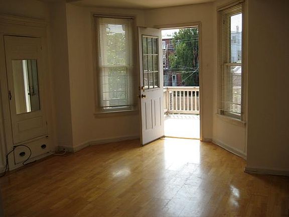 This unique second floor 2 BR apartment has all wood floors and a cleverly designed kitchen/living area that opens onto a large sunset facing deck. The apartment has both front and back entrances with an off-street shared parking pad in the rear. The apt has all amenities including W/D (in unit) and CAC. There is a designated secure space in the basement for extra storage. Renter is reponsible for Gas and Electric