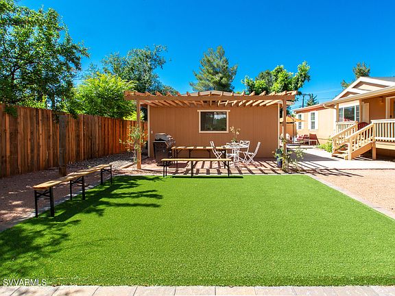Impressive kitchen, adorned w/ an abundance of cabinets, stainless steel appliances, and a walk-in pantry. This culinary haven is designed to delight & inspire. The 200 sq ft outdoor finished storage space presents an opportunity for conversion into a casita/in law quarter. The fully fenced private lot ensures privacy, while the cobblestone patio & outdoor fire pit provides a cozy setting for gatherings & relaxation. Garden w/ raised beds & a convenient water picket system makes gardening a breeze, ensuring your plants thrive with ease. This well-maintained, very clean manufactured home is truly a gem in Sedona.