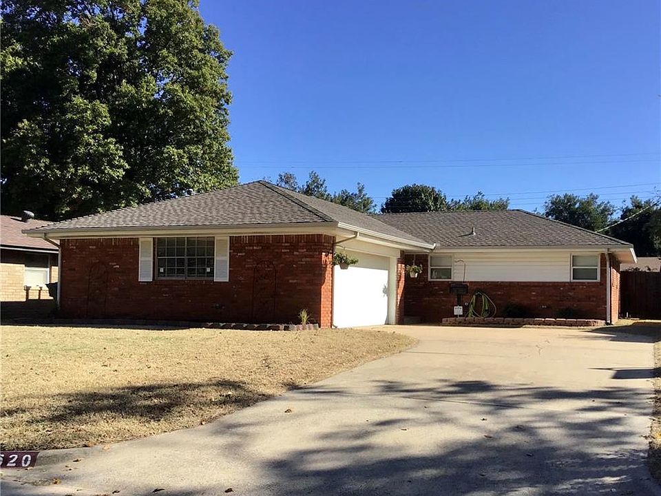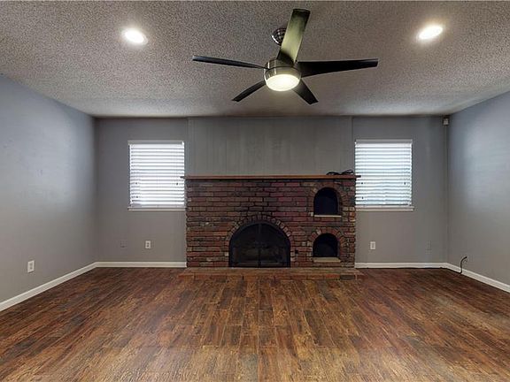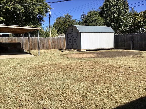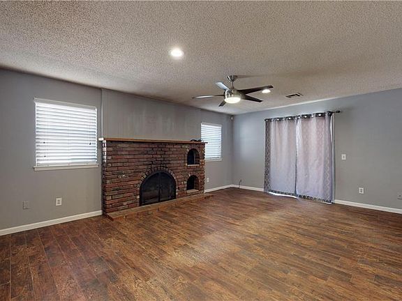 Beautiful home with lots of updates. Outside updates include a privacy fence, an awning over the patio, and flower beds. There is also a 12x15 storage shed and a storm shelter in the garage floor. Inside updates include wood look tile flooring throughout, and granite counters in the kitchen. Gray tone paint throughout the home. Living has a brick fireplace and a ceiling fan controlled with a remote. Kitchen has updated fixtures, sink, and tile backsplash. The built in microwave is over the smooth top stove. Master has a full bath with a shower and a walk in closet with built in shelves. There are two coat closets and linen storage in the hallway.