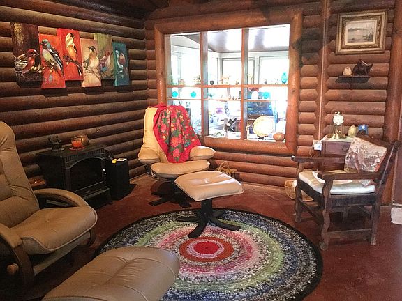 1972 log cabin with early additions, expanded kitchen, enclosed back porch and 2nd bathroom with outdoor access. New 1KSF workshop/storage added 2019. River access. Own water well. Almost one acre. Many trees and shade.