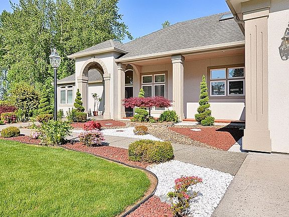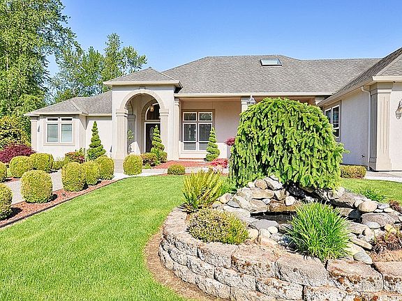 Custom built Mascord "The Grayson" Design Home on private gated 5 acre lot. 1.5 miles off I-5 freeway. Single level luxury home with separate formal living room, dining room and family room. Open floor plan with high ceilings. 3 large bedrooms with walk-in closets, 2 1/2 baths, office with french doors, laundry room with sink. Master Suite with french doors, marble floors/countertop and Jacuzzi tub, Granite countertops in kitchen, cherry cabinets, stainless steel appliances, skylight. Hardwood/carpet/marble flooring. Custom crown molding. Central air/heat pump. Central vacuum. Beautiful wood burning stove fireplace. 3 car garage with large driveway for additional parking. Private well, septic tank. Landscaped front yard with water feature. Large covered front porch. Guest house perfect for mother-in-law: 1 bedroom, 1 bath, separate living room, full kitchen with granite countertops, laundry inside, 2 car garage, RV parking. Large garden with mature fruit trees/bushes (pears, apples, plums, cherries, blueberries, blackberries, strawberries, grapes). Raised garden beds, perfect for summer vegetable planting. Variety of flowers, bulbs and ornamental trees.