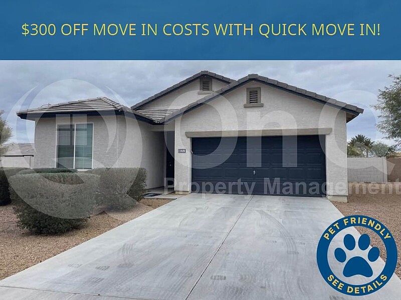 ** $300 OFF MOVE IN COSTS WITH QUICK MOVE IN! ** 1,687 SQ FT! 3 bedroom, 2 bath home in Avondale's Del Rio Ranch! Desirable single story floor plan. Modern eat-in kitchen with included appliances and large center island/breakfast bar. Open concept living/dining, great for entertaining! Neutral interior with tile flooring in all the right places. Split bedroom floor plan offers 3 nicely sized bedrooms, each with optimal privacy! Primary suite with full bath + walk-in closet. Blinds + ceiling fans! Included washer/dryer. Enjoy an oversized backyard with covered patio and optimal privacy! 3 car tandem garage with epoxy flooring. Located on a desirable cul-de-sac lot with no behind neighbors! Great Avondale location with easy I-10 access. **This property requires a minimum credit score of 650 APPLICATION: $65 Application Fee Per Applicant 18 years or older (Nonrefundable). Please allow 24 to 72 business hours to process the Application once all required documents are submitted by all applicants 18 years or older. LEASE LENGTH: 12-month Minimum (Longer Lease Term may be negotiable) INITIAL MOVE-IN COSTS: Upon application approval, a nonrefundable Holding Retainer will be required to secure the property and will be applied towards the move-in costs. The Holding Retainer amount is determined by the type of Security Deposit option you choose. Applicants can choose between a traditional Security Deposit which may be 1.25 times the monthly rent but not greater than 1.5 times the monthly rent (75% refundable) or a Security Deposit Alternative program (only available on long-term leases of 12 months or more). A $250 one-time lease preparation fee as well as the first month's rent is due prior to move-in. Pet Policy: Dogs and Cats Allowed with the following exceptions: Pets will be considered upon approval! If the Applicant has a Pet, $150 Non-Refundable Pet Fee per pet. RECURRING MONTHLY COSTS: There is a 3.3% Administration Fee. If the Applicant has a Pet, a $35 Pet Rent Per Pet (Does Not Apply to Assistive Animals). All On Q Property Management Residents are enrolled in the Resident Benefits Package for $39 or $49 with pets, which includes liability insurance, credit building to help boost the resident's credit score with timely rent payments, move-in concierge service making utility connection and home service setup a breeze during your move-in, Renter to Buyer program, and much more! *Other terms and conditions may apply. All information including advertised rent and other charges are deemed reliable but not guaranteed and is subject to change.