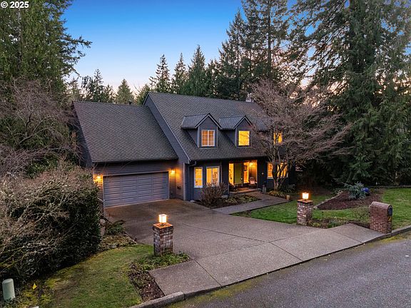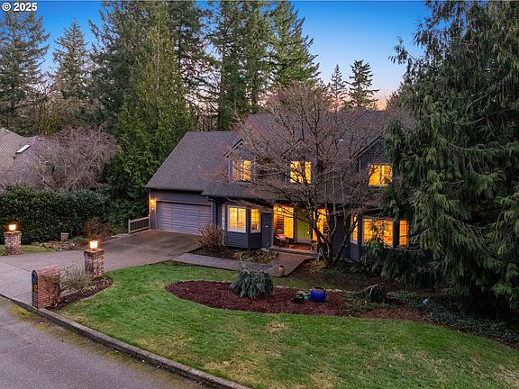 Enchanting dormer and bay windows peek out behind a mature Japanese maple and vibrant hydrangea that bursts with purple and blue blooms every spring. Exquisite light-filled main level with open floor plan and newly refinished hardwoods is ideal for elegant dinner parties. A wet bar divides the formal dining and living room where a grand gas fireplace awaits. Built-in speakers and surround sound complete the mood. Separate dedicated office/den with fresh carpet also on the main. Upstairs, the primary suite spans the west wing, offering a private sanctuary with corner jetted soaking tub, double vanities, walk-in closet, and extra storage space. Three additional bedrooms and brand-new luxury vinyl plank flooring in the laundry and upper bathrooms. Incredible lower level designed for versatility, whether as a guest apartment or movie theater. The cozy family room has another gas fireplace, rustic log paneling, and a projector and 3D screen that stay with the home! Lower level also features a bedroom, wine cellar, wet bar with beer taps, workshop/storage space, and access to a serene stone patio leading to the tree-lined backyard with raised garden beds. Additional highlights include a 50-year Presidential roof, fresh interior paint, and easy access to Tryon Creek Natural Area, Loll Wildwood Natural Area, and I-5. [Home Energy Score = 2. HES Report at https://rpt.greenbuildingregistry.com/hes/OR10236153]