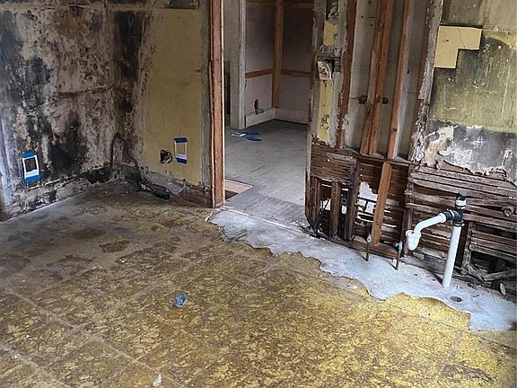 Home is ready for a complete overhaul. Home is being sold as is. Layout could be kitchen, dining room, living room, two bedrooms, and bathroom on main level. Upstairs could be a third bedroom.