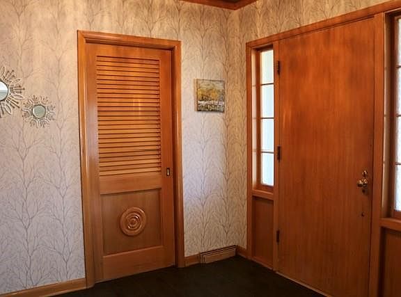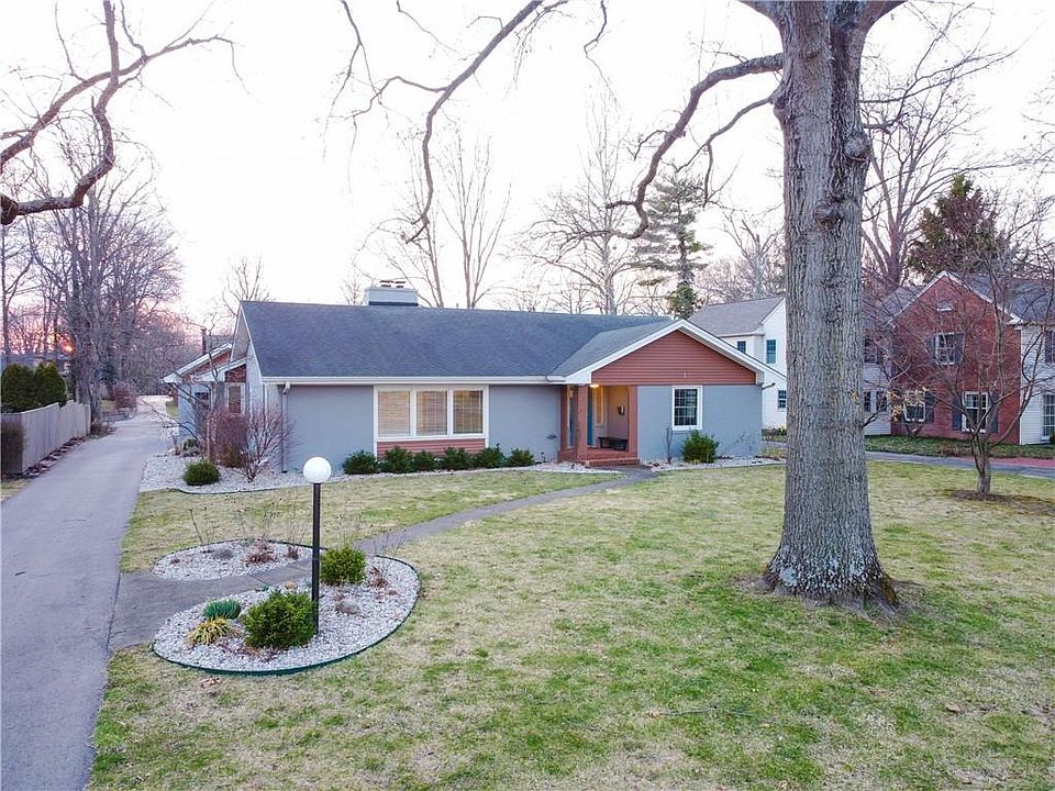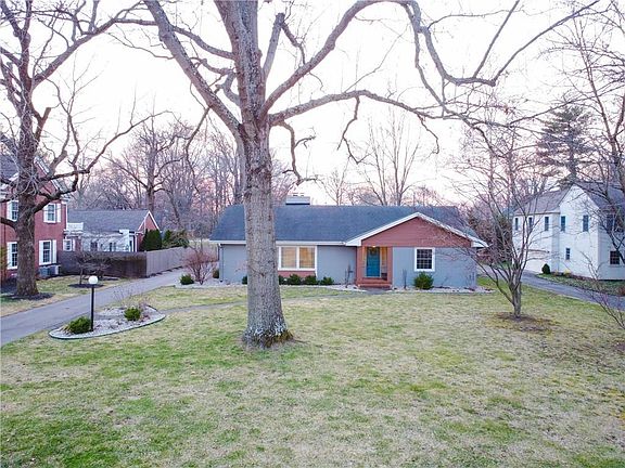 Mid-century modern ranch with a large, private backyard that includes a new deck and full fence. This all-brick home with a finished basement has been recently updated with new HVAC, new kitchen appliances, new gas fireplace and feature wall, new garage door, and new flooring, interior paint, window coverings, and light fixtures in many rooms. Great room with solid red and white oak flooring. Designer kitchen with granite counters and travertine floors. Main-floor laundry. Sunroom. Plenty of parking on a new concrete pad behind the garage. Mature trees and new plantings including 3 locust trees and hundreds of perennials and herbs; raised garden beds.