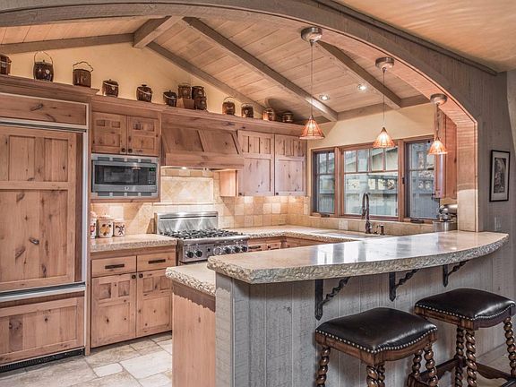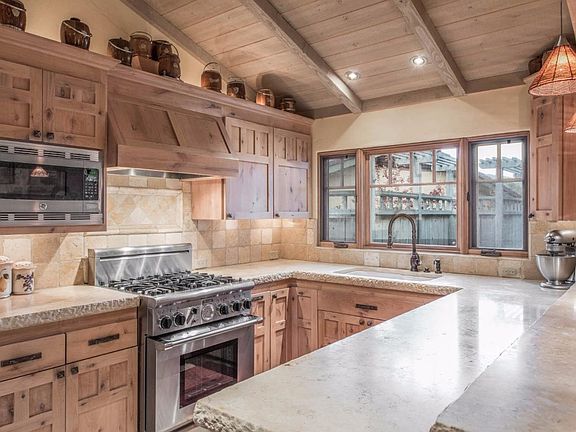 Little expense was spared with this warm and inviting renovation. Thoughtful open-flow floor plan with Jerusalem stone and hard wood floors throughout boasting wonderful natural light. Fabulous Chef's kitchen with high-end appliances, chipped edge stone counter tops and custom solid knotty-Alder cabinetry in kitchen, both baths, and doors. Vaulted open beam ceilings offering decorative niches above and bull nose plaster throughout. Wonderful Carmel Stone fireplaces in dining/great rooms with custom iron enclosures bring warmth and charm. Master and guest bath offer the same chipped-edge Jerusalem stone finishes with oversized walk-in shower/bench and soaking tub in master. Custom Sierra Pacific windows and French doors bring the outside in, ample storage and all sitting on a large .28 acre lot with circular drive. Enjoy this exceptional single-story Carmel charmer!
