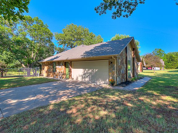 This home features an edmond mailing address, is in Logan County, and Deer Creek Schools This one story home was built in 1981 and has 4 bedrooms, 3 bathrooms, and is a true mother-in-law plan. As you enter you will walk on beautiful flagstone floors with a skylight and can see the formal dining room. There is a spacious remodeled kitchen with lots of cabinets, granite counters, and stainless steel appliances. The casual eating area off the kitchen has both a desk and a built-in buffet with glass display. Enjoy your morning coffee in the breakfast nook with a large picture window looking out over the backyard. The living room has a dual sided flagstone fireplace which it shares with the master bedroom, built-in bookshelves on either side and has a cathedral ceiling. The generous size master bath has a separate tub and shower and has a skylight. There is both a covered deck and an open patio. The backyard is spacious with great trees and a storage building. The perfect family home! owner/agent.